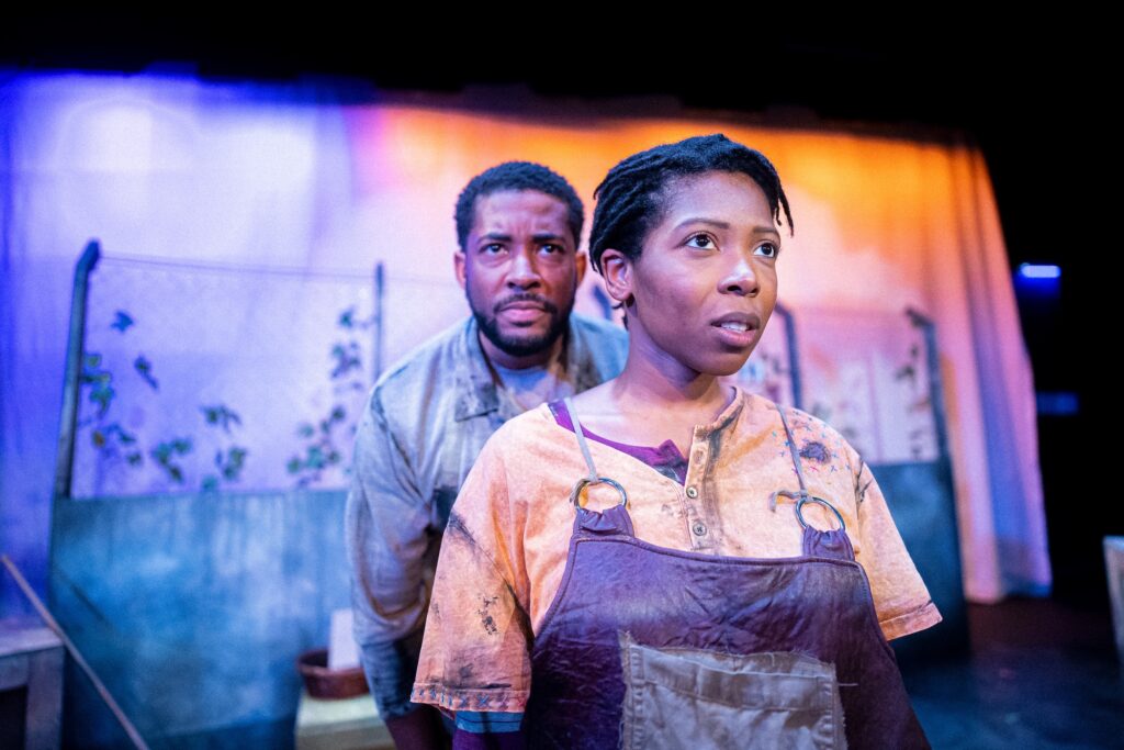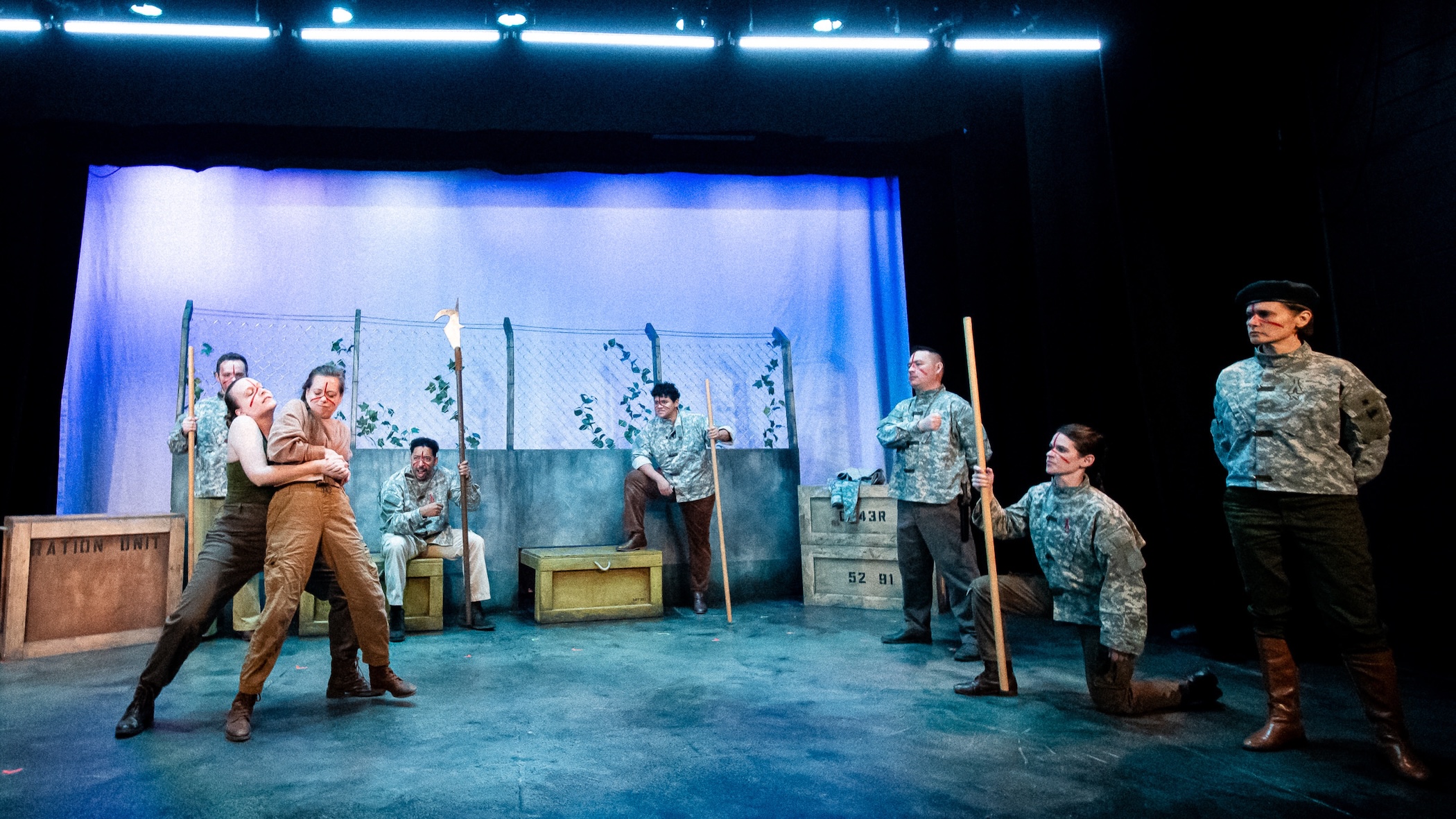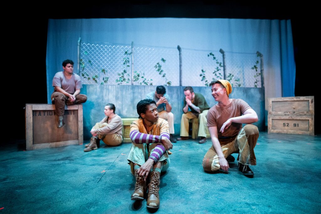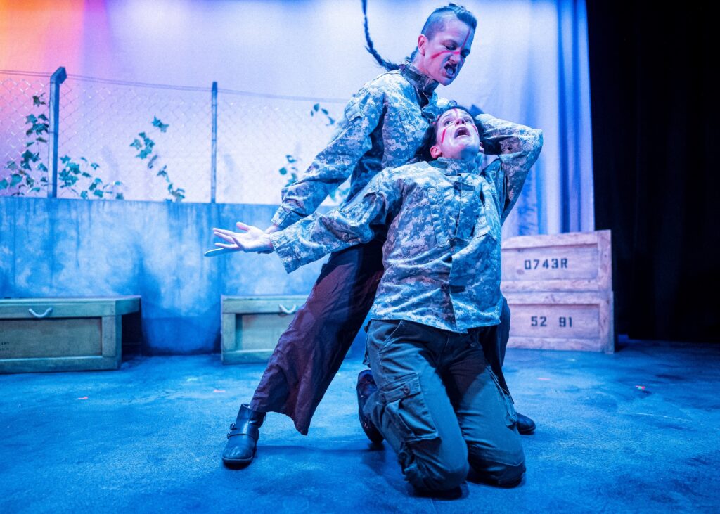 Leff’s “Hunger Games”-like premise is the perfect vehicle for a Babes with Blades show. A Babes show always brings the fight! This one is no exception. Hazel Monson directs multiple skirmishes between ensemble members. The clashes start out as several combative competitions. A raging Maureen Yasko (Cain) is a fierce standout as she is the one to beat. Her intense confrontations are mesmerizing. And Whit Baxter Bates (Jack) also captivates for their child-like delight in the war games. An impressive Monson orchestrates a climatic bloody feud where abrupt action has the audience gasping.