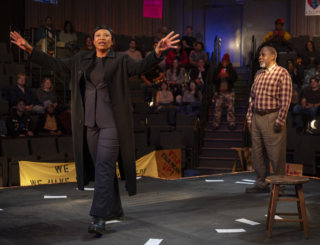 McCraney provides plenty of thought-provoking content. He also gets cheeky with it. Jouley encourages everyone to turn on their phones while making fun of audience members for keeping their phones on. Davis continually goads theatre goers to side with him on the settlement. And Potts tells Arenas that she looks like the woman that he met with earlier. McCraney does a great job of balancing the drama and comedy while never losing the importance of the underlying message.